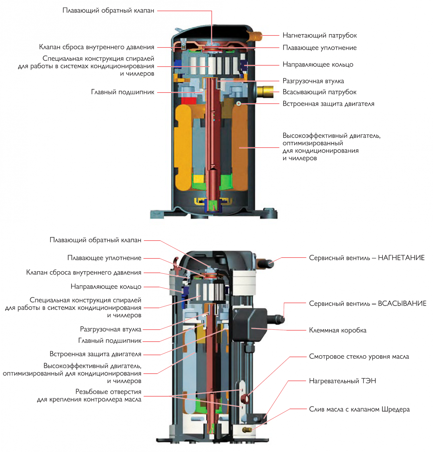- Специально разработаны для кондиционирования и чиллеров, особенность конструкции которых заключается не только в спиралях но и как в конструкции в целом, а точнее модельный ряд компрессоров создан исходя из потребностей клиентов.